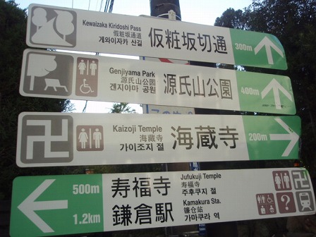 扇ヶ谷架道橋を抜けると、再び道案内の看板が並びます。銭洗弁財天の道は書いてありませんが、化粧坂切通を経由していくことをチェックしていたため、そちらに向かいます。