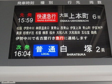 案内掲示板を見ると、15時59分に大阪上本町行きがあり、それに乗れば途中の伊勢中川から名古屋行きの急行に乗れることがわかり。