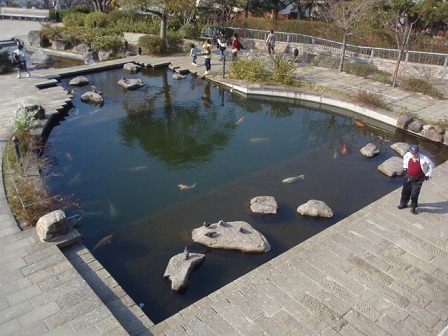 部屋から見下ろした池。遠目でも鯉が泳いでいるのを見ることができます。