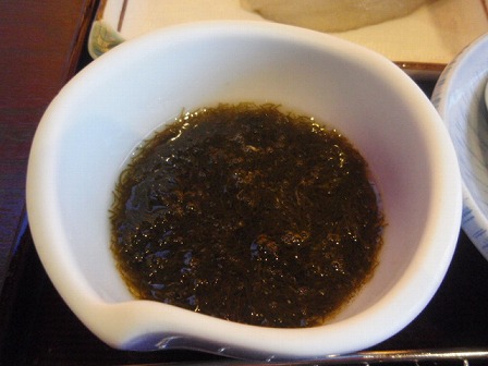 輪島の方の郷土料理である「すいぜん」というものです。寒天のような食感で、左にあるタレをつけて食べます。