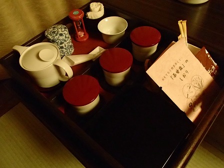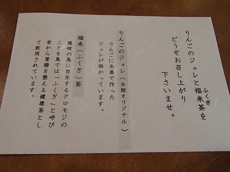 ロビーで受付をするとのことでロビーに向かい、まずはお茶とゼリーが出されたので食べて寛ぎます。お茶は福来茶、ゼリーはりんごのジュレとのこと。