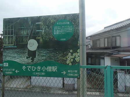 各駅に停まる時には、その駅の妖怪が描かれた看板もあります。普通の駅名の方が小さく書いてあります。