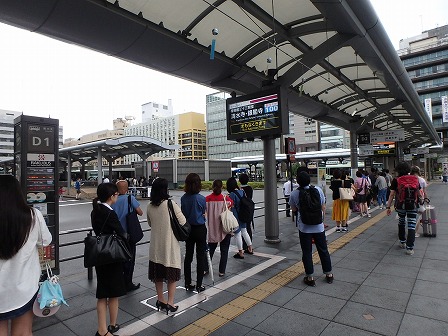 すでに大勢並んでいます。バスの本数は多めなので、時間は気にせずに待ちましょう。