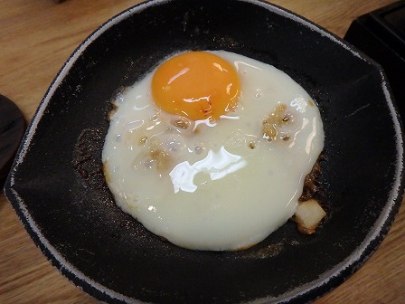 生卵もついており、先の味噌の漬物炒めのところに入れて食べることも可能です。今回は目玉焼きにしてみました。残った味噌と漬物の香りと混じりあい、これまたご飯が進みます。