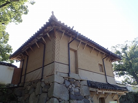 宗門櫓。補修修理工事中のため、土の色の状態です。外の荒壁を乾燥させているため、乾燥後に漆喰塗り等を行うとのこと。江戸時代に一度壊れたものの、その時代に復建された櫓。