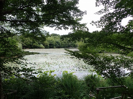 まずは龍安寺の園内を歩いていきます。大きな池「鏡容池」の脇を抜けていきます。