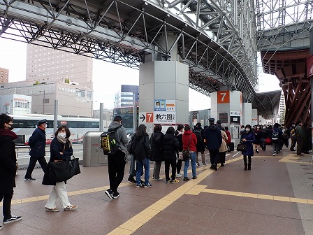 バス停には時節柄人が少ないかと思いきや、結構な人数が並んでいます。日本人観光客も多め。