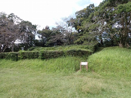 きれいに草の生えた堀が見え。石垣ではなく土塁。