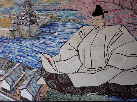駅のエスカレーターを下っていくと豊臣秀吉の姿を描いたガラスで描かれた大きな絵が見えます。