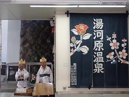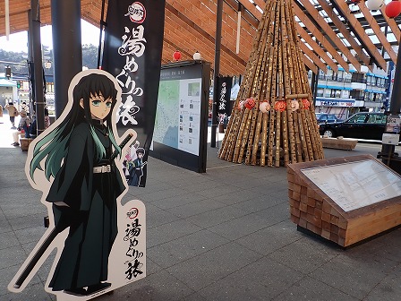 改めて駅前の「鬼滅の刃 湯めぐりの旅」の立て看板やのぼりなど。いろいろ写真を撮りましたが、アニメも漫画も読んだことがありません。
