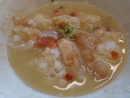 最後にご飯と刺身を少し残しておき、別途用意されている出汁をかけて雑炊風に。