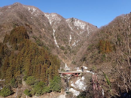 高台から見た黒部峡谷鉄道。