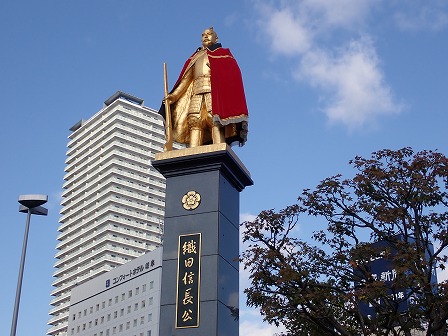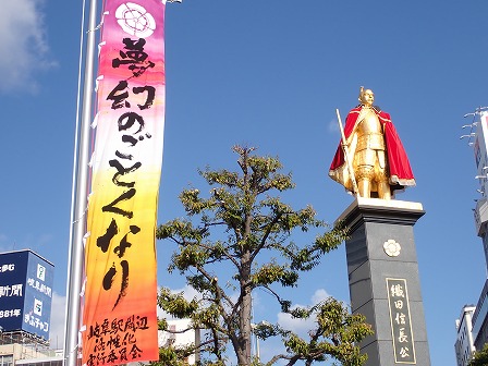 岐阜駅前にある織田信長公の黄金の像。6年前に訪れた時には赤色のマントはついていませんでしたが、今回はマントがついています。その下には黄金のマントもあるので、マントを二重に羽織っていることに。