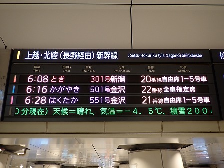 朝早くの6時28分発のはくたか551号を利用。9時32分着の約3時間。東京から大阪までが2時間30分ですので、さらに長い時間、乗車することになります。