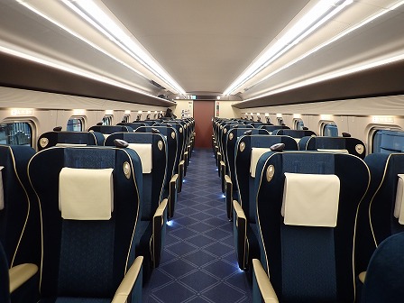 グリーン車の様子。朝早くということもあり、ほとんど人がいません。また、東海道新幹線と座席の形状が異なり、狭いように感じます。