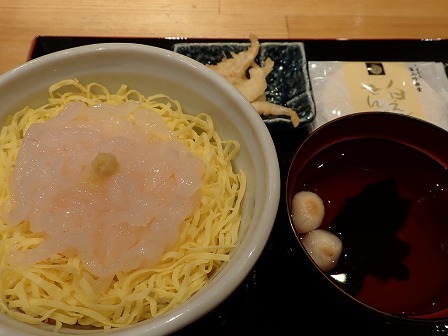 ぷりぷりした白海老がご飯と錦糸卵の上に乗っています。別皿に白えび天ぷらと、白えびせんべえ。