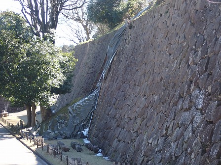 正月に発生した能登半島地震の影響か、石垣が崩れたのかシートで覆われており、近くは通り抜け不可になっていました。