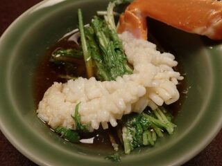 延楽 宇奈月温泉の夕食は宿泊の部屋とは別の部屋に案内されて提供されました。 プランとしては料理にプラスαがあるプランを頼みました。 前菜。 お酒を注文。館主お薦めの地酒三種。朝日町 林酒造「大吟醸 黒部峡」、高岡市 清都酒造「純米吟醸 勝駒...